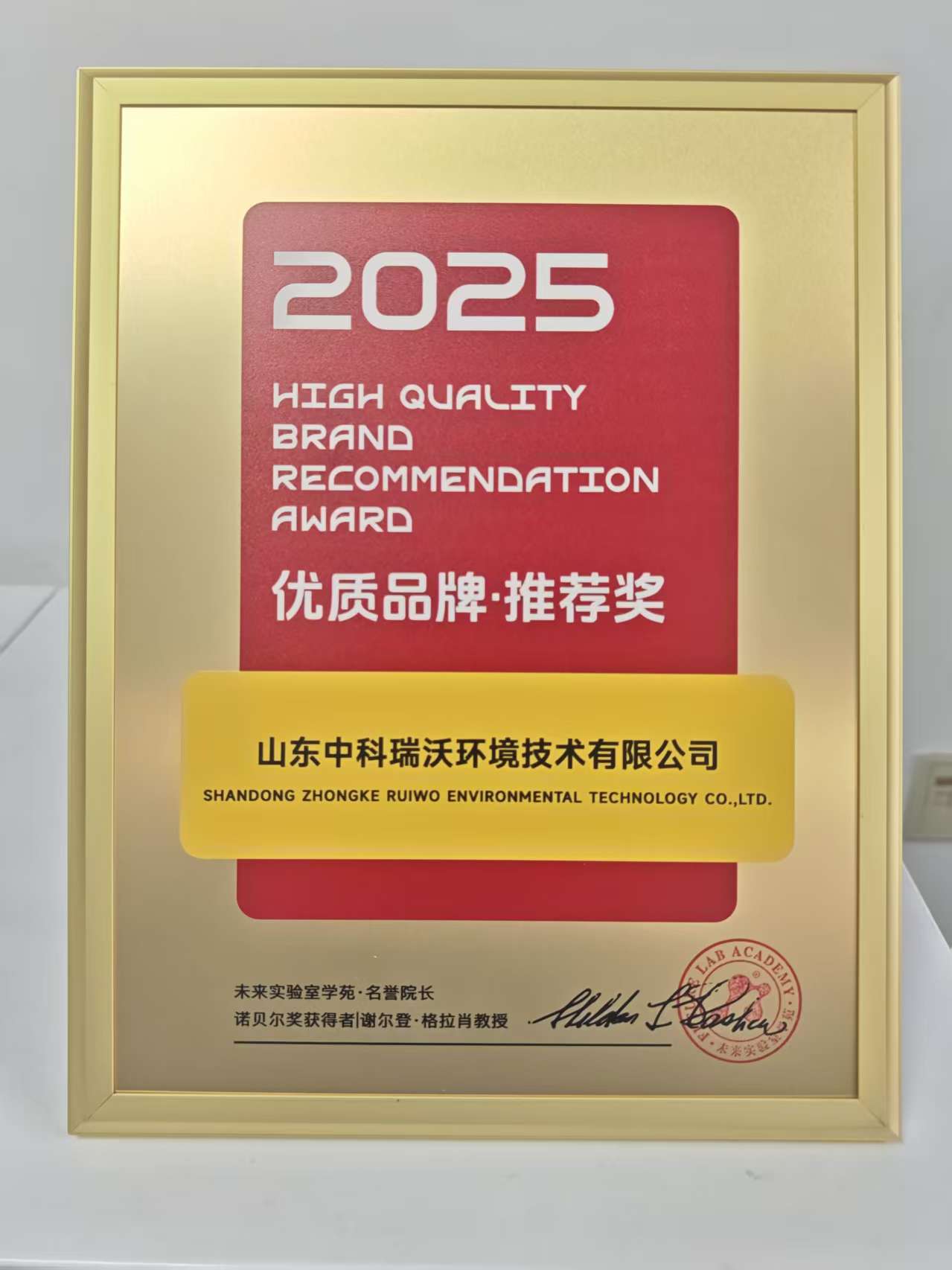 2025年4月10日,山東中科瑞沃環(huán)境技術(shù)有限公司在2025未來(lái)實(shí)驗(yàn)室創(chuàng)新與發(fā)展大會(huì)暨第十屆未來(lái)實(shí)驗(yàn)室建設(shè)與裝備展覽交易會(huì)上,旗下“中科瑞沃”品牌喜獲未來(lái)實(shí)驗(yàn)室學(xué)苑·名譽(yù)院長(zhǎng)、諾貝爾獎(jiǎng)獲得者:謝爾登·格拉肖教授頒發(fā)的《優(yōu)質(zhì)品牌推薦獎(jiǎng)》。