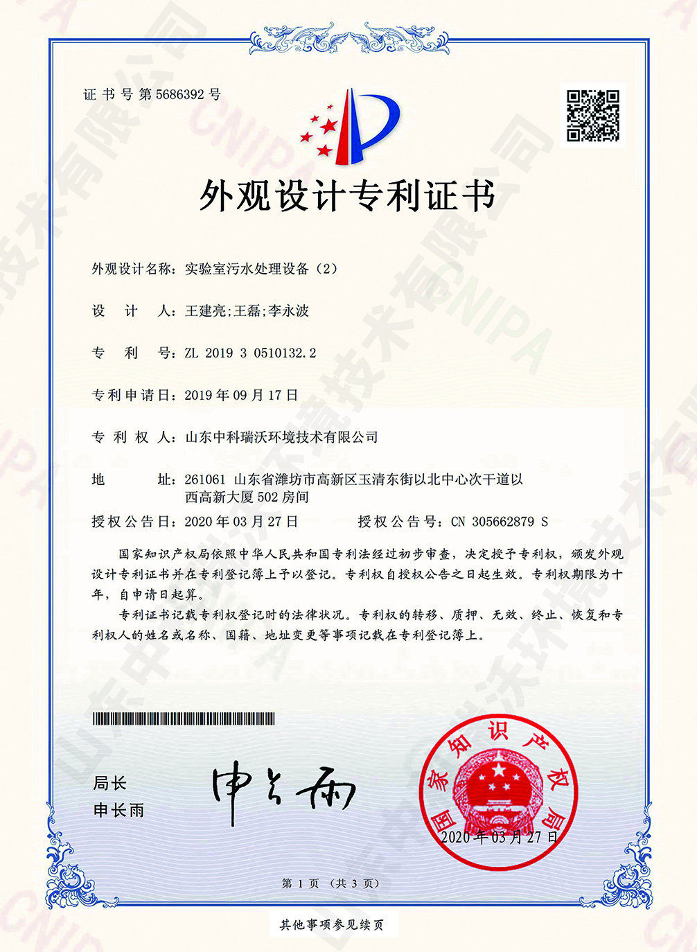 全自動中水回用設(shè)備~專利證書